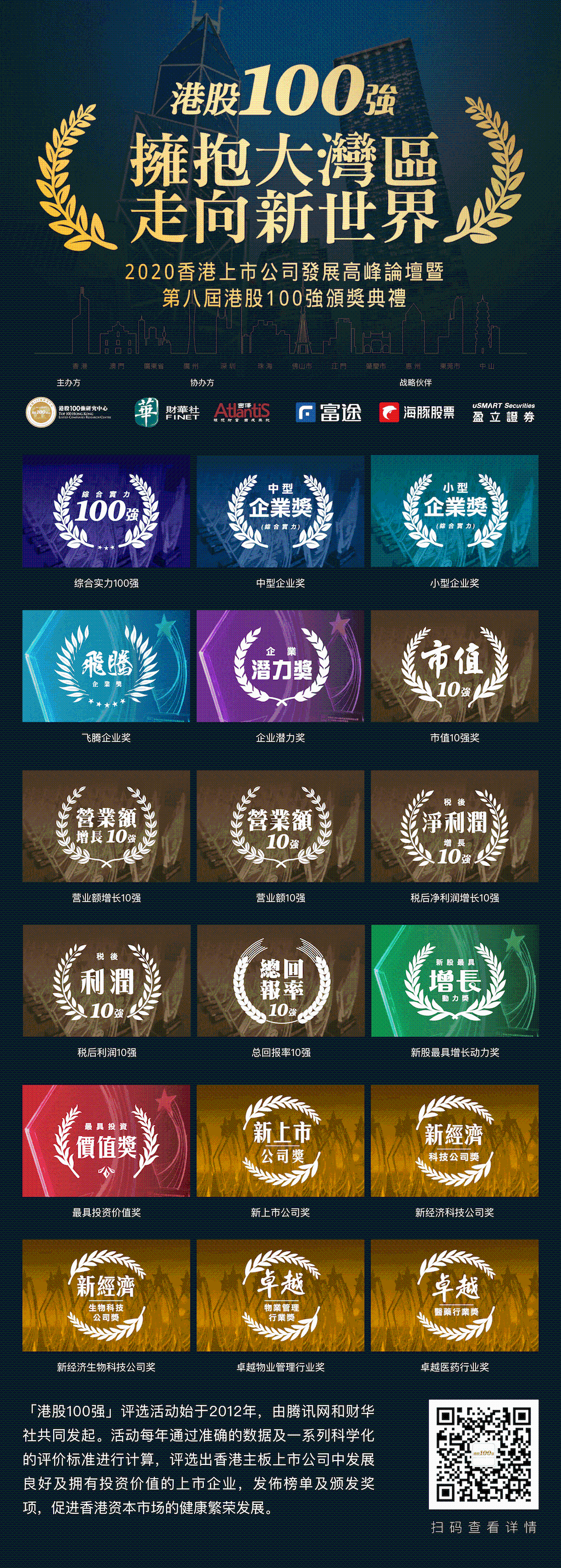 由港股100強研究中心主辦,財華社、西澤投資管理協辦的“擁抱大灣區 走向新世界(600628,股吧)——2020香港上市公司發展高峰論壇暨第八屆港股100強頒獎典禮”活動,於2020年12月21日舉行。作為首個香港和內地共同合作對香港上市公司的評選,“港股100強”自2012年誕生以來逐步成為香港財經界與金融界的年度盛會之一。本次大會吸引到大批政商學界權威人士及多位上市公司主席、高管及知名金融機構負責人出席或采用在線直播的方式參與,共同分享精彩時刻。